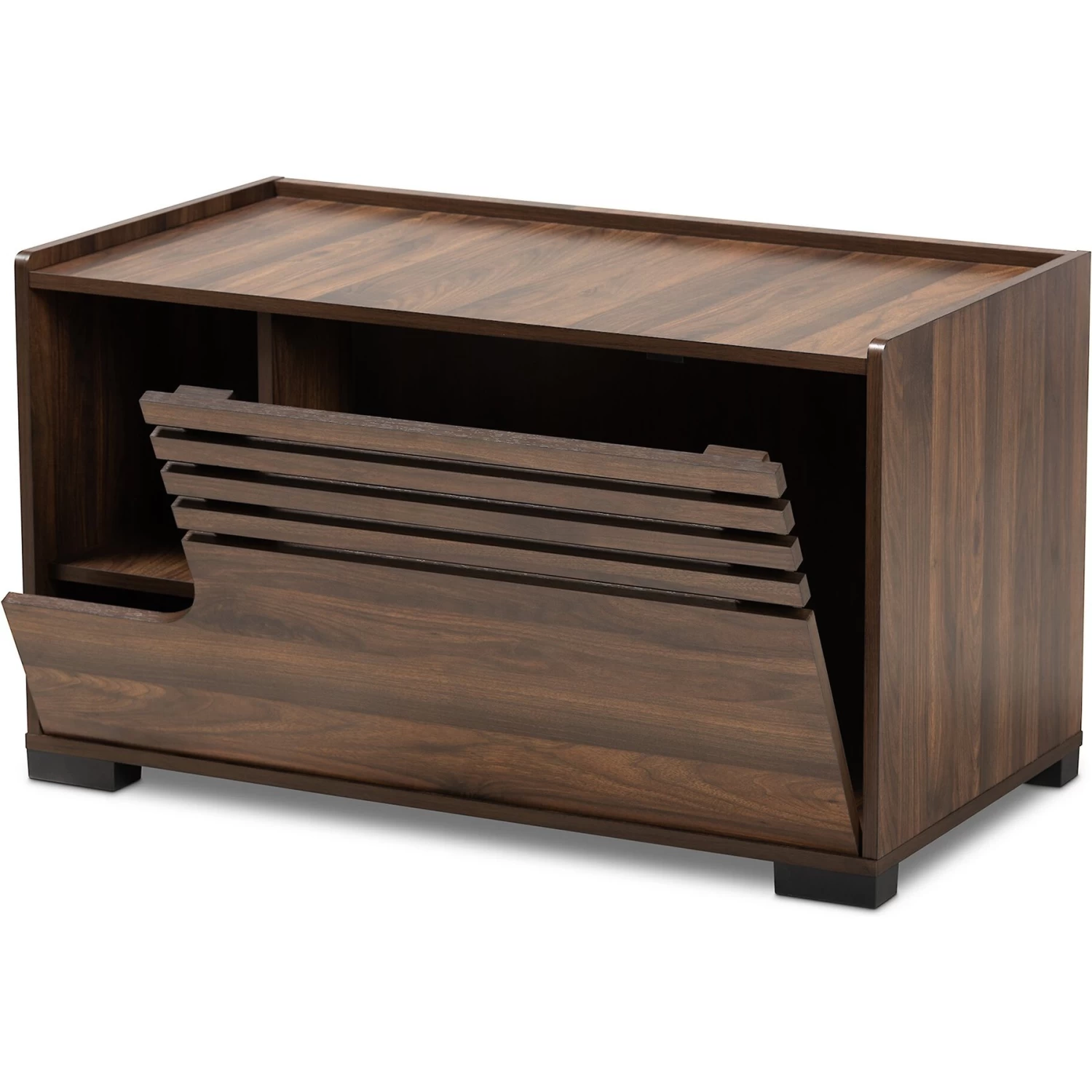 - Designed with a fold-down door with slatted design for ventilation.