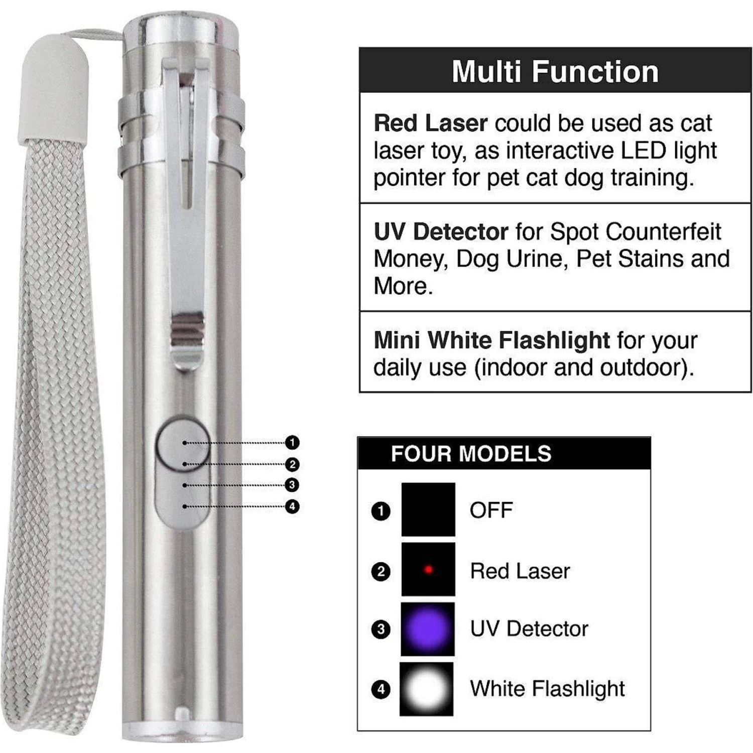 - Easy-to-use laser pointer also includes a UV detector light and flashlight for your other household needs—like detecting urine, spotting counterfeit money, and finding toys in the dark.